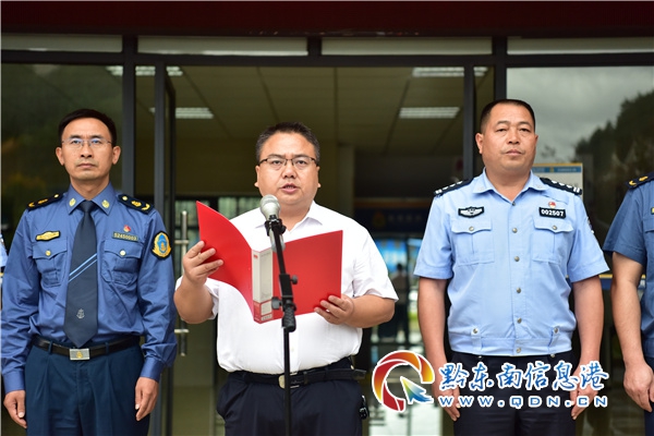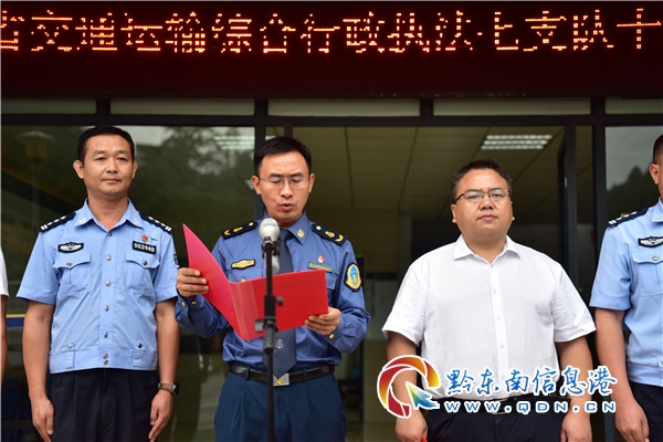 本網訊 8月24日,貴州省交通運輸綜合行政執法七支隊十四大隊揭牌儀式在雷山縣舉行。雷山縣人民政府副縣長許亮,貴州省交通運輸綜合行政執法七支隊臨時工作組副組長歐邦武出席儀式,并為貴州省交通運輸綜合行政執法七支隊十四大隊揭牌。