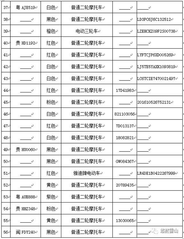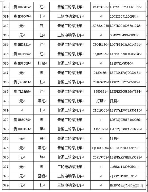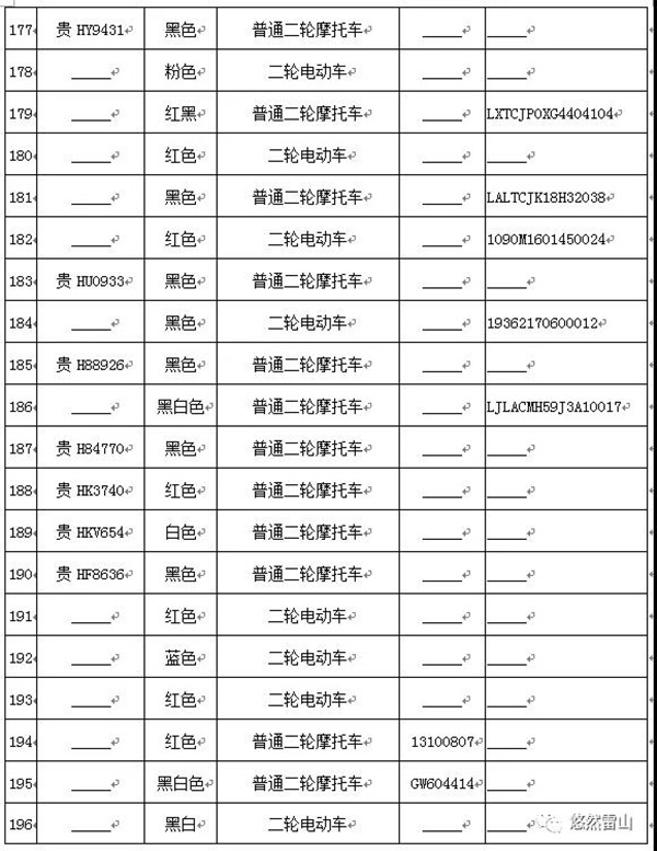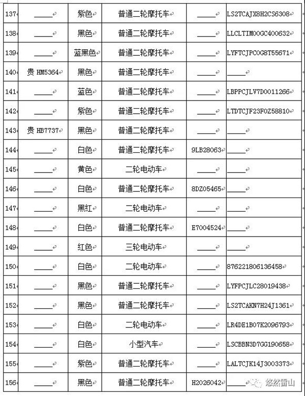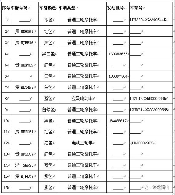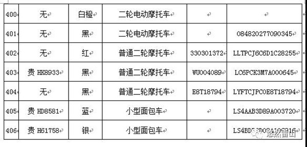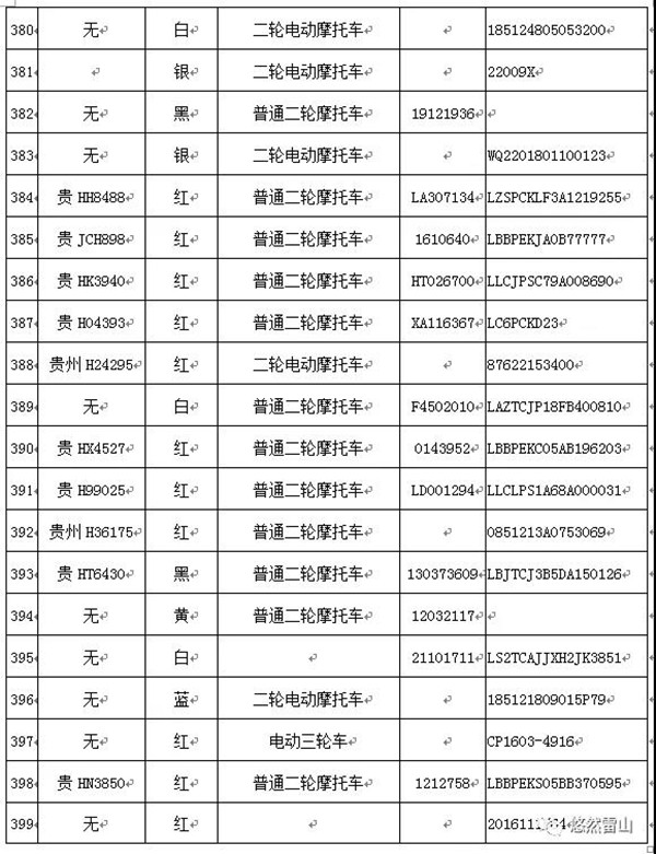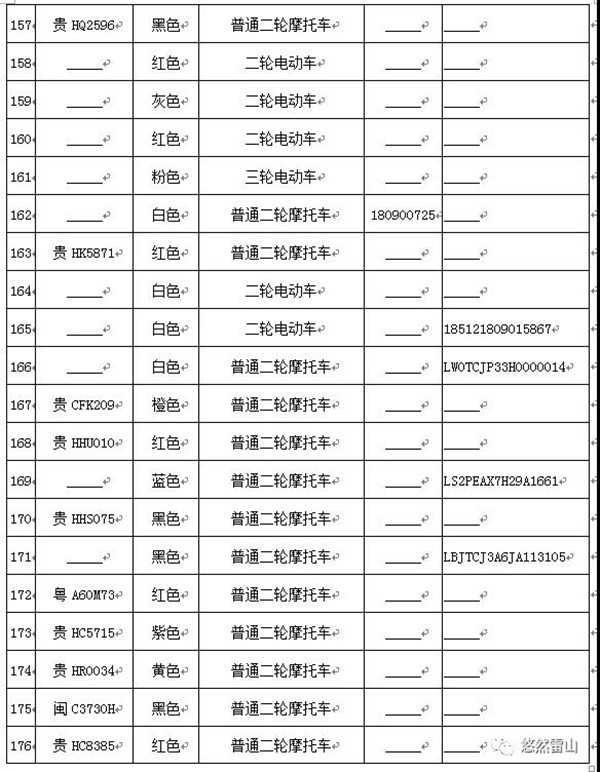 雷山縣公安局交警大隊依法扣留且逾期不來接受處理機動車清單