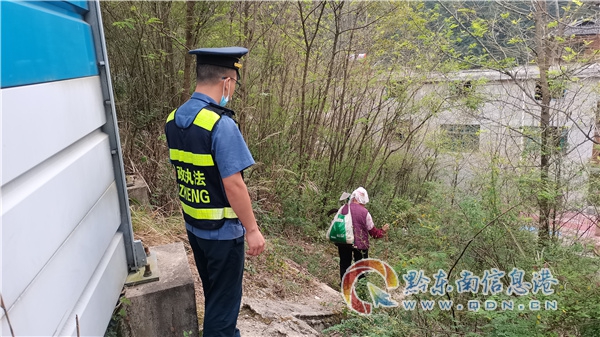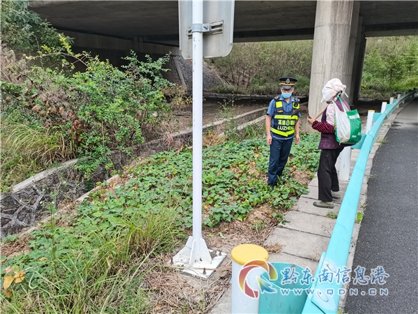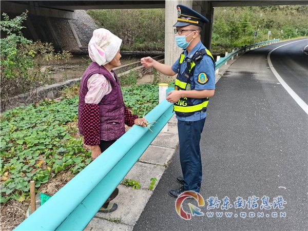 本網訊 10月10日下午,貴州省交通運輸綜合行政執法七支隊十四大隊路政員巡查至S63凱從高速K16+100黃里收費站匝道時發現,有一位老人在高速公路用地范圍內的土地上勞作,路政員立即上前進行制止。