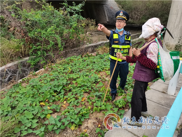 通過詢問得知,老人是附近村寨的村民,看到此處有片空地,便徒步穿越高速公路來種植紅薯。路政員立即告知老人此地在高速公路修建時已被征用,屬于高速公路用地范圍,任何人在高速公路用地內進行耕種屬于違法行為;同時教育老人在高速公路上行走是十分危險的事情,極易引發交通安全事故。