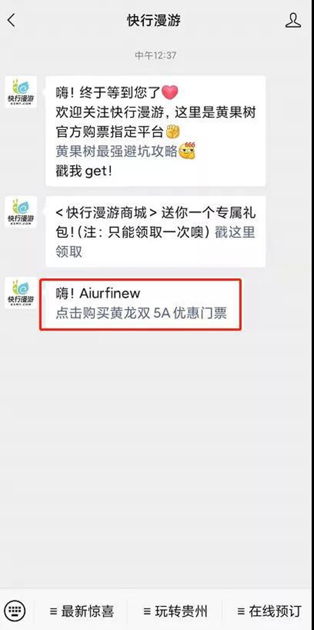 (1)進入快行漫游公眾號,點擊最新驚喜—黃龍雙 5A 優惠門票;