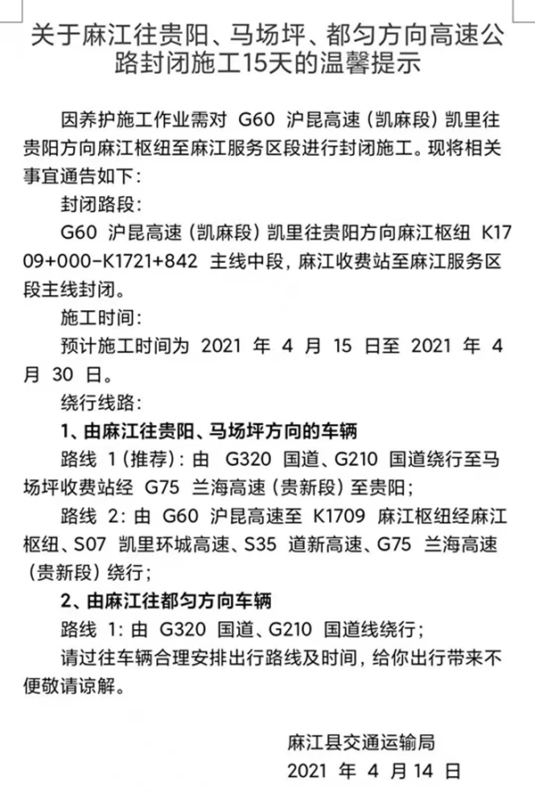注意!關于麻江往貴陽、馬場坪、都勻方向高速路封閉施工15天的通告