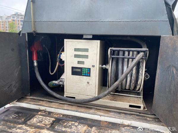 經(jīng)查,這是一輛非法改裝的非法“流動(dòng)加油車”,隱蔽的貨廂里有油罐、加油機(jī)等加油設(shè)備,就是一個(gè)移動(dòng)加油站,同時(shí)也是一個(gè)移動(dòng)的“炸彈”,執(zhí)勤人員隨即對(duì)該車的駕駛?cè)诉M(jìn)行詢問(wèn)了解情況并控制車輛,據(jù)駕駛?cè)丝谑觯凸迌?nèi)裝有1000多升的成品油。