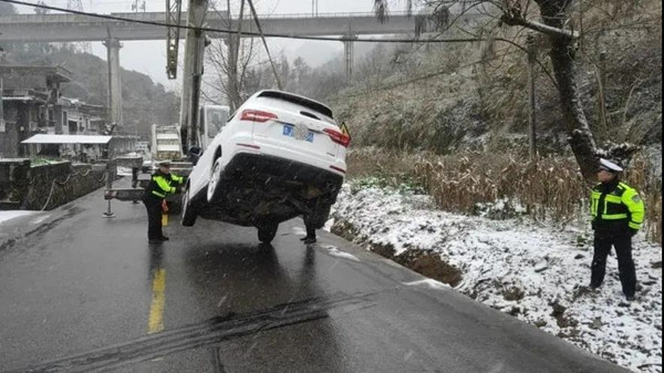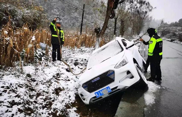 民警接警后立即趕到現(xiàn)場,經(jīng)了解,車內(nèi)人員只有駕駛員一人。由于該車需要施救,民警聯(lián)系了應(yīng)急部門處理,因該車受損不重,并能繼續(xù)行駛,駕駛?cè)吮硎疽^續(xù)前往都勻。民警告訴駕駛員雨雪天氣駕駛機動車要觀察好路面情況,控制車速等安全常識后,在確保安全的情況下,讓其駛離。