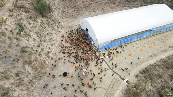走進劍河縣革東鎮辣子村騰順養殖場,一陣響亮的吆喝聲在養殖場的山間回蕩,成群的肉雞從養殖大棚中蜂擁而出,劉仕賢將谷物倒入食槽中,雞群圍繞在食槽周邊大快朵頤。