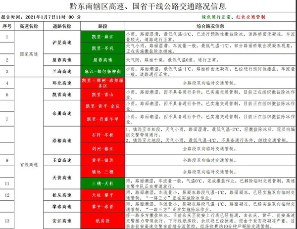 2021年1 月7日截止11時黔東南轄區高速、國省干線公路交通路況信息: