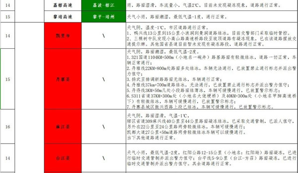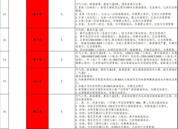 1. 鎮石線17公里至18公里處溜沙關路段已結冰,車輛無法正常通行;鎮石線35公里至37公里小地名扎營關路段已結冰無法正常通行;羊都線4公里至9公里路段已結冰無法正常通行,且下小雨結冰情況還在加劇。