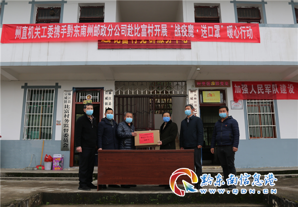攜手州郵政分公司赴麻江縣比富村開展“戰疫魔·送口罩”暖心活動,支助疫情防控物資口罩2600個價值約0.5萬元