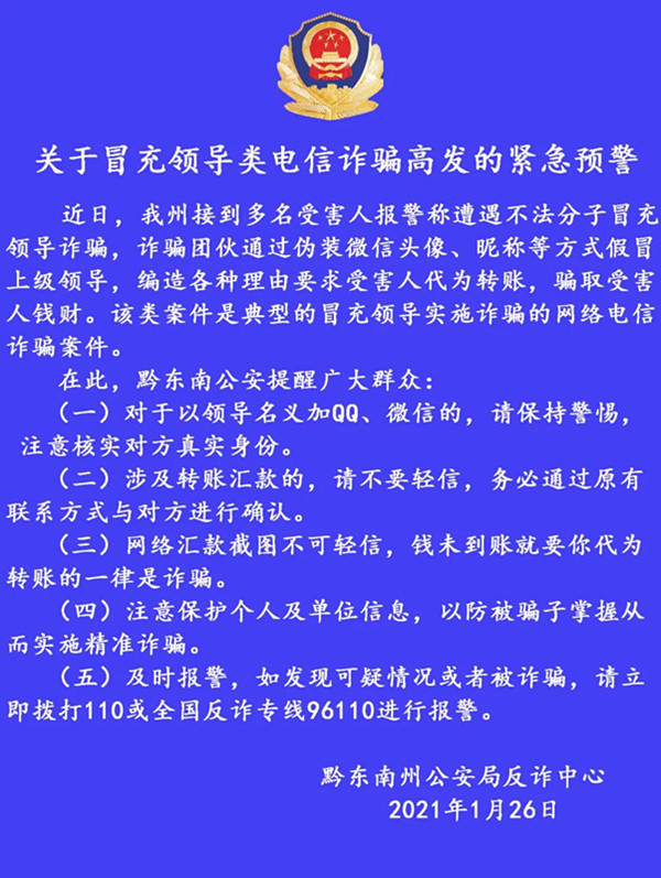 州公安局發布關于冒充領導類電信詐騙高發的緊急預警