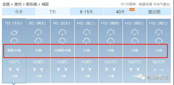 本周我州多陰雨天氣,部分路段有雨霧,請注意交通安全;最高氣溫普遍在10℃以上,16縣(市)城區日最高氣溫16~22℃,將出現在14日,日最低氣溫6~11℃,將出現在8日。早晚氣溫低,需注意用火用電安全。具體預報:7日夜間到8日全州陣雨或雷雨轉陰天;9日陰天轉陣雨或雷雨,部分鄉鎮有中到大雨;10日陰天有小雨,部分鄉鎮中雨,黔東南州西部部分路段有雨霧;11~12日陰天,夜間到早晨有小雨,個別鄉鎮中雨,黔東南州西部部分路段有雨霧;13~14日陰天間多云,夜間到早晨有分散陣雨。