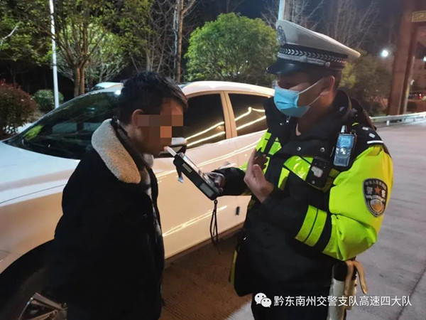 當(dāng)日24時左右由于返程務(wù)工車輛較多車流量較大,貴州省黔東南州公安局黨委委員、交警支隊支隊長肖文斌一行在滬昆高速公路沿線巡查高速公路通行情況以及各收費(fèi)站、服務(wù)區(qū)執(zhí)勤情況,當(dāng)巡查至滬昆高速公路劍河收費(fèi)站時發(fā)現(xiàn)一輛越野車停于匝道休息,于是肖文斌支隊長上前去檢查車輛情況時,發(fā)現(xiàn)該駕駛員存在涉嫌喝酒駕駛機(jī)動車的違法行為,于是通知高速交警四大隊民警前往處置調(diào)查處理。