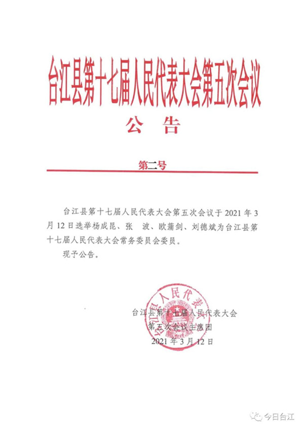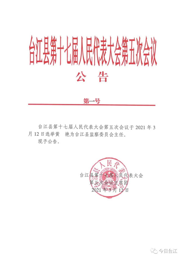 黃艷當選為臺江縣監察委員會主任;楊成昆、張波、歐蒲劍、劉德斌當選為為縣十七屆人大常委會委員
