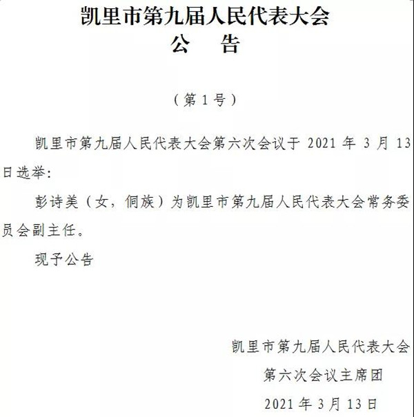 2021年3月13日,在凱里市第九屆人民代表大會第六次會議上當選為凱里市第九屆人民代表大會常務委員會副主任。