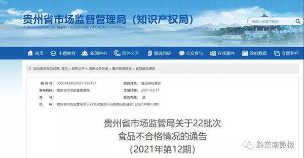 近日,貴州省市場監督管理局網站發布關于22批次食品不合格情況的通告。