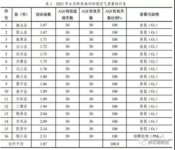 2021 年 6 月,全州 AQI 優(yōu)良天數(shù)比例為 100%,16 個(gè)縣(市)AQI 優(yōu)良天數(shù)比例均為 100%。