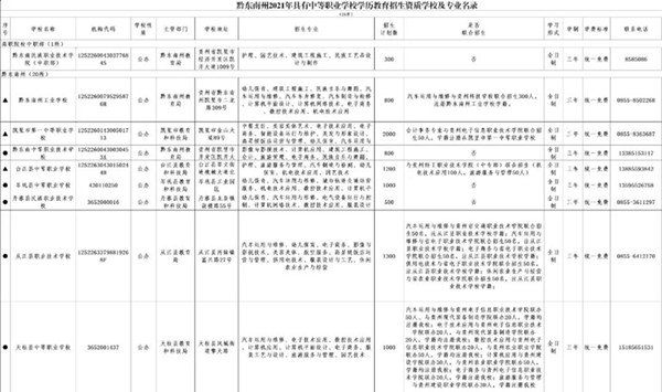 根據(jù)近期全州中職學(xué)校招生工作情況,黔東南州教育局發(fā)現(xiàn)有部分學(xué)校存在虛假招生、不具備招生資質(zhì)學(xué)校在進(jìn)行招生,違規(guī)招生等情況,為了避免學(xué)生、學(xué)生家長及學(xué)校的利益受到損害,黔東南州教育局現(xiàn)將《黔東南州2021年具有中等職業(yè)學(xué)校學(xué)歷教育招生資質(zhì)學(xué)校及專業(yè)名單》公布如下: