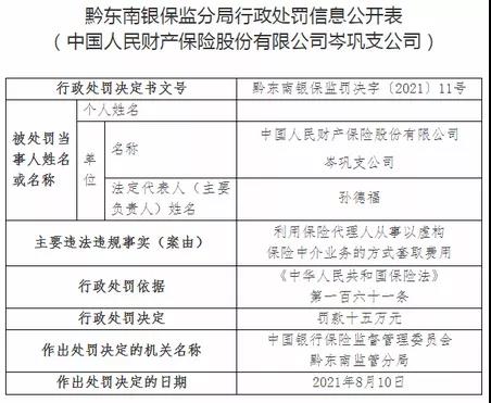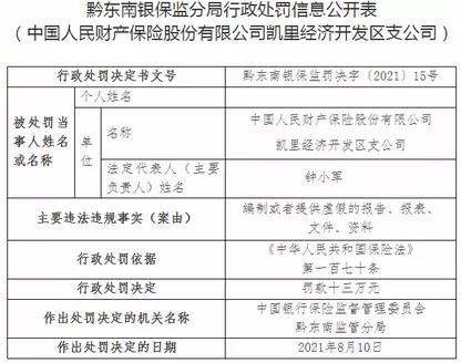 中國人民財產保險股份有限公司凱里經濟開發區支公司因編制或者提供虛假的報告、報表、文件、資料,被罰13萬。