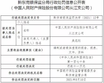 中國人民財產保險股份有限公司從江支公司因編制或者提供虛假的報告、報表、文件、資料,被罰11萬。