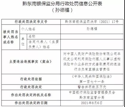 8月17日消息,黔東南銀保監分局一連開出11張罰單,劍指中國人民財產保險股份有限公司5家支公司存利用保險代理人從事以虛構保險中介業務的方式套取費用及編制或者提供虛假的報告、報表、文件、資料等違規行為。
