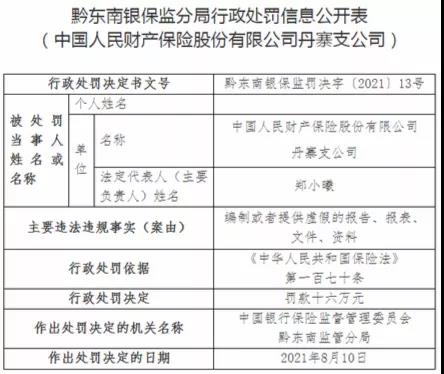 中國人民財產保險股份有限公司丹寨支公司因編制或者提供虛假的報告、報表、文件、資料,被罰16萬。