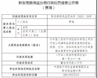 此外,賈海對中國人民財產保險股份有限公司劍河支公司編制或者提供虛假的報告、報表、文件、資料的違法行為負有直接主管責任和監督管理責任,被警告并罰款2萬元。