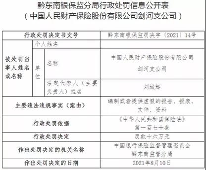 中國人民財產保險股份有限公司劍河支公司因編制或者提供虛假的報告、報表、文件、資料,被罰16萬。