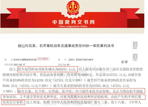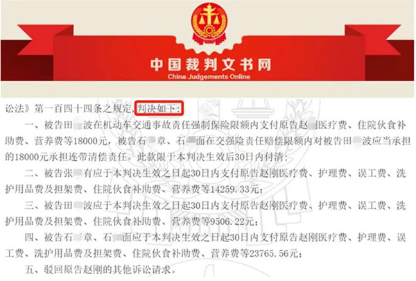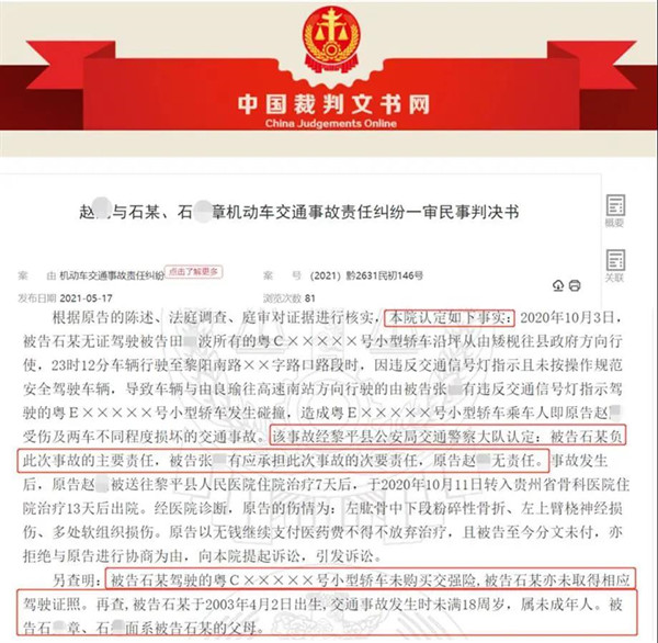 裁判文書網(wǎng)顯示,貴州省黎平縣人民法院于2021年3月25日對此案作出判決:該事故經(jīng)黎平縣公安局交通警察大隊(duì)認(rèn)定,被告石某香負(fù)此次事故的主要責(zé)任,被告張某有承擔(dān)此次事故的次要責(zé)任,原告趙先生無責(zé)。