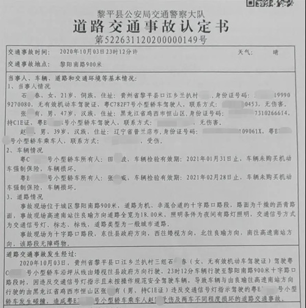 “2020年11月9日和11月25日,我分別收到了兩份道路交通事故責(zé)任認(rèn)定書,但兩份認(rèn)定書上,肇事女生的姓名等身份信息卻不一樣。”趙先生告訴記者,11月9號的那份認(rèn)定書上,事故主要責(zé)任人名叫石某春,年齡21歲。而11月25日的那份認(rèn)定書上,事故主要責(zé)任人則變成了17歲的石某香。兩份認(rèn)定書上,均寫明肇事女生是無證駕駛。