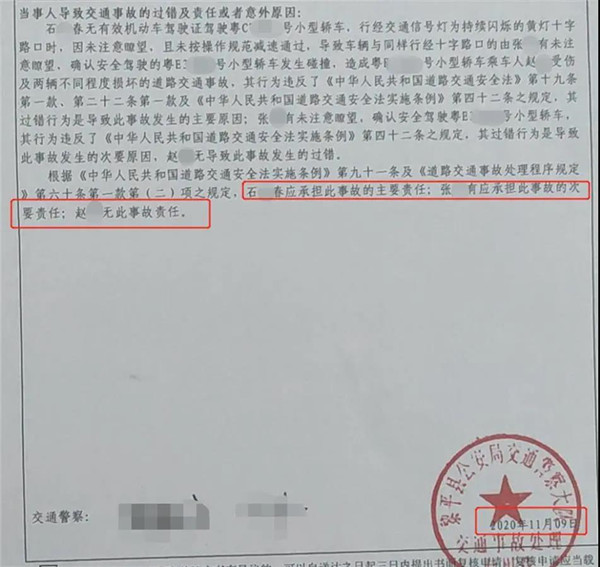 2020年11月9日事故認(rèn)定書上半頁(來源:趙先生提供)
