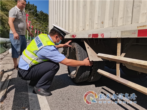 當日10時40分許,黔東南州公安局交警支隊高速五大隊卡點疏導組正在錦屏收費站執勤。民警看到前方匝道入口不遠處有輛輕型貨車停在那里,民警立即上前查看,原來是貨車發生爆胎后司機正準備現場換胎,而且后方沒有任何警示標志。此時車流量比較大,交警立即在后方擺上警示錐桶后隨即看輪胎損壞程度。只見貨車右后邊兩只輪胎全部炸裂,車輛完全動不了,交警冒著大太陽在烈日下與師傅把車修好。