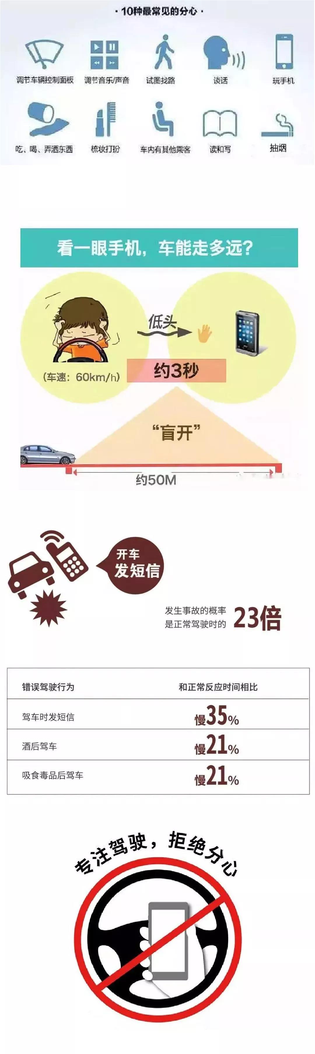 當(dāng)你將注意力分散在駕車以外的事物時(shí),也就此埋下了安全隱患。某個(gè)動作只需要一兩秒,當(dāng)車速達(dá)到60km/h(高速公路最低行駛速度),兩秒鐘就能行進(jìn)幾十米,車速越快,越多不可控的事就會在這一瞬間發(fā)生。所以駕車上高速路必須全神貫注、不可分心,看手機(jī)、吃東西、吸煙等行為必須禁止,才能抑制此類危險(xiǎn)的發(fā)生。
