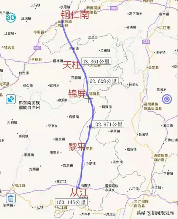 由銅仁南站引出,經天堂鄉,坪地鎮,于天柱縣城西部團結村附近設天柱站,之后往南經高釀鎮,茅坪鎮,于敦寨鎮設錦屏站,繼續往南經新化鄉,于黎平縣高屯街道潭溪村附近設黎平站,之后往南經中潮鎮,終于從江縣洛香鎮,引入從江站。