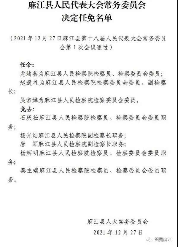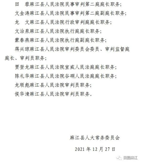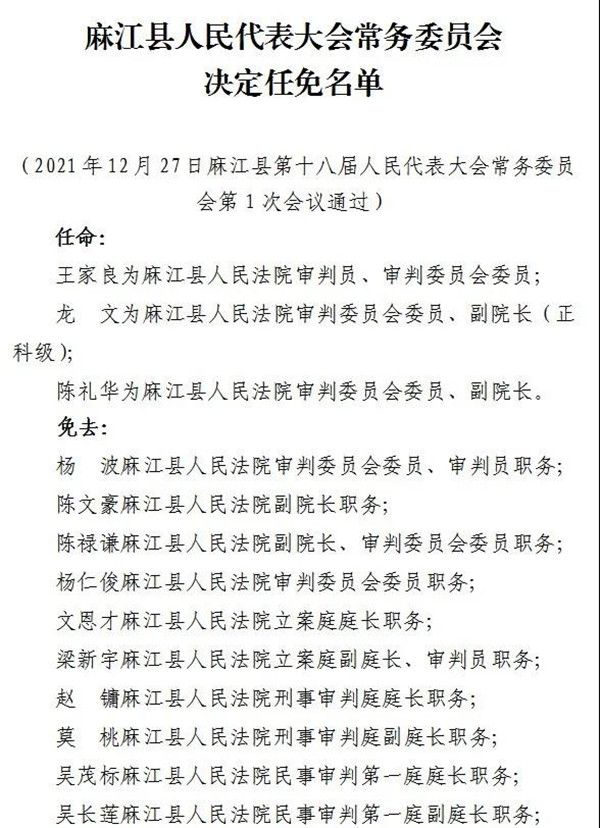 會(huì)議依法進(jìn)行人事任免,任命薛斌同志為縣人民政府副縣長(zhǎng),陸顯著同志為縣農(nóng)業(yè)農(nóng)村局局長(zhǎng),楊文艷同志為縣文體廣電旅游局局長(zhǎng),龍獻(xiàn)良同志為縣工業(yè)信息化和商務(wù)局局長(zhǎng),謝隆珍同志為縣人民法院副院長(zhǎng),龍琦同志為縣人民法院副院長(zhǎng)、審判委員會(huì)委員,潘先菊、閆安義同志為縣人民檢察院副檢察長(zhǎng),楊忠瓊同志為縣人民法院審判委員會(huì)委員,袁再亮同志為柳川鎮(zhèn)人民法庭庭長(zhǎng)。