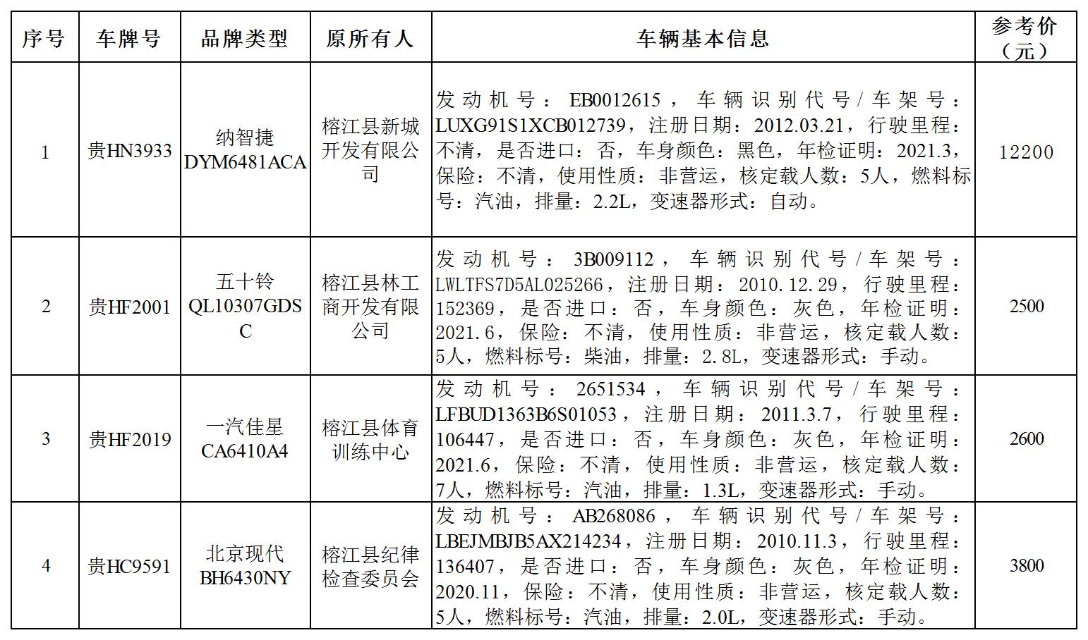 受委托,本公司于2021年7月5日(星期一)下午14:30時在榕江縣財政局會議室對以下標的進行公開拍賣: