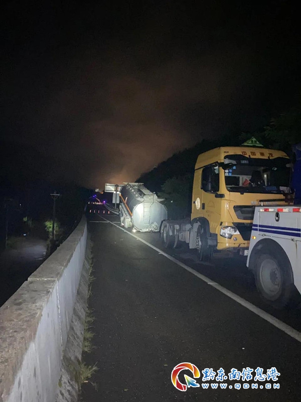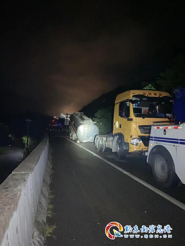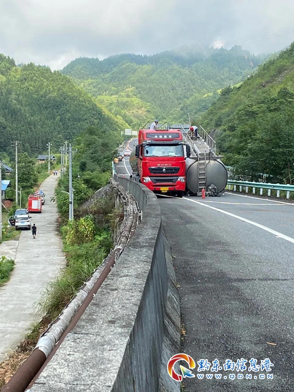 消防救援人員到達現場發現,一輛載有27噸汽油的油罐車,由三都開往榕江方向,在行駛至榕江縣境內廈蓉高速四格服務區的匝道時,罐體與車頭發生分離,罐體完好,未發生泄漏,未造成人員傷亡,據油罐車司機稱罐車在途經三都時就已經發現異常并未停下來,欲強行將車開至四格服務區準備進行維修,當行駛到服務區匝道一段上坡段時,罐體發生脫落。