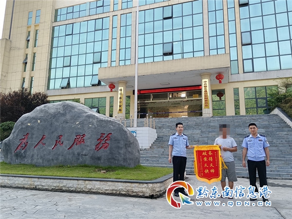 本網訊 8月2日,轄區群眾歐某將一面“破案又快 長得又帥”的錦旗送到榕江縣公安局網安大隊大隊長楊永賦手中,感謝公安民警為他找到遺失的電動車。