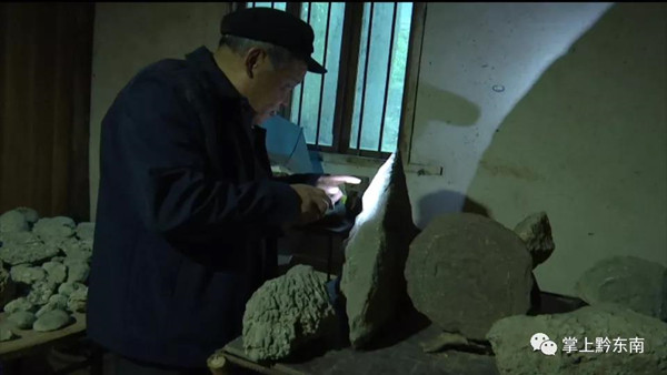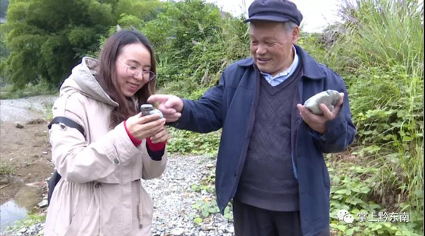 榕江縣奇石愛好收藏者 易忠誠:“我喜歡撿文字石頭,現在家里面有很多,也送禮一些給朋友,如果是按重量來講,有好幾萬斤了,出來走走對我身體也好處,也得到鍛煉。”