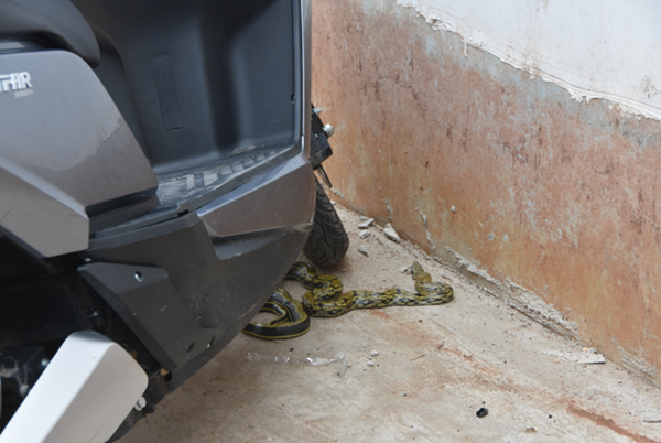 只見一條蛇盤卷在小區院壩摩托車底盤下