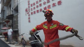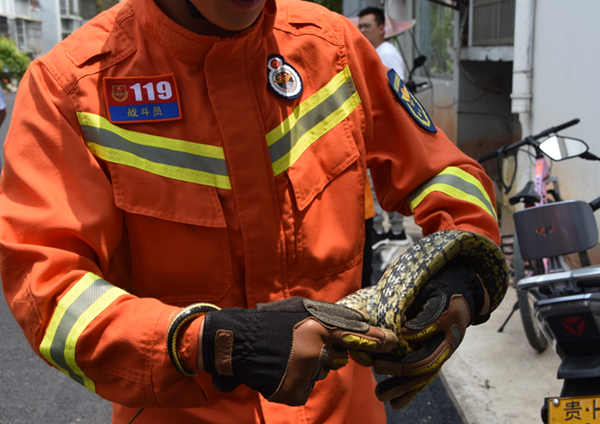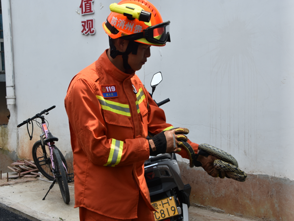 經現場勘查確認,此蛇為無毒的菜花蛇,隨后兩名指戰員穿戴好個人防護裝備,利用抓蛇器三兩下功夫就將菜花蛇給抓住,警情處置結束并在歸隊途中放生(潘勝文)