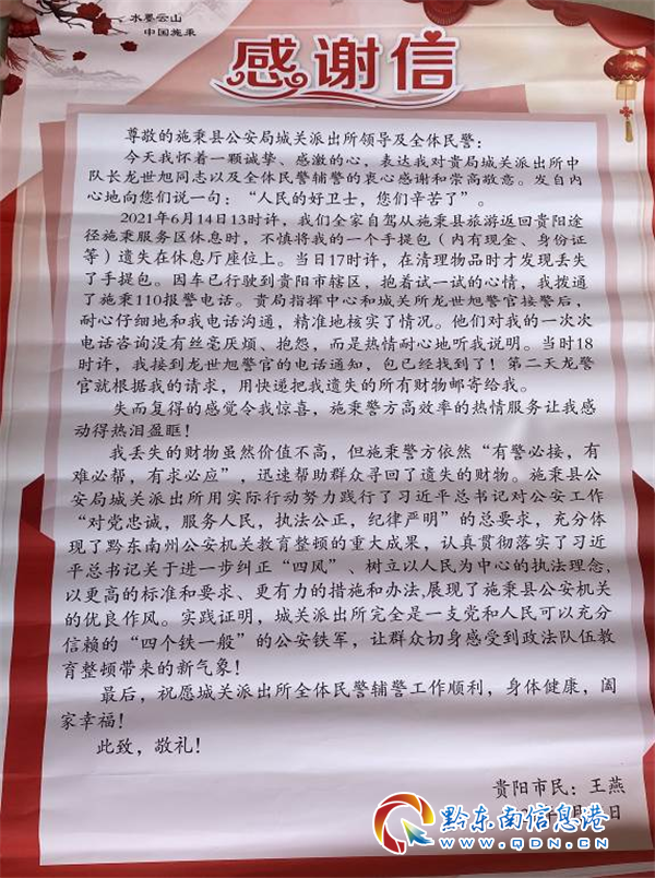 本網訊 6月22日,一個裝有“為民解憂 情系百姓”的錦旗和一封感謝信的快遞送到施秉縣公安局城關派出所民警手中,對民警認真、負責的工作態度表示感謝和肯定。