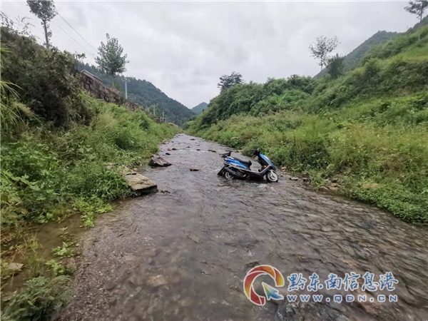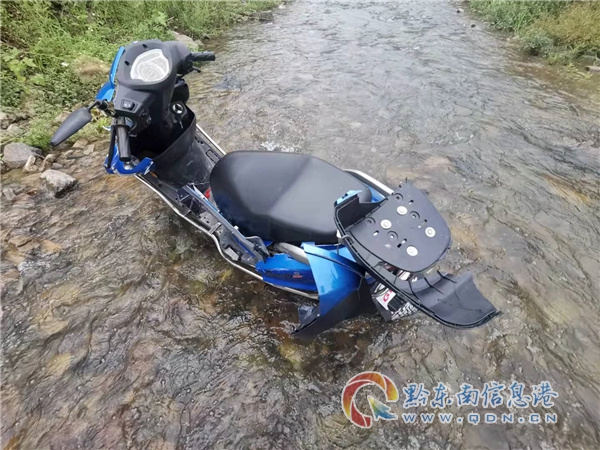 事發馬號鎮通往六合村的鄉間小道,民警趕到現場發現,一輛藍色二輪摩托車倒在河水中,十分醒目,車身受損嚴重,一塊小轎車的車牌卡在摩托車側面。白色越野車停在河邊的道路上,車前部占用了半邊道路。
