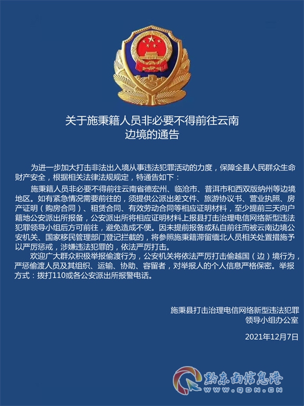 施秉籍人員非必要不得前往云南省德宏州、臨滄市、普洱市和西雙版納州等邊境地區。如有緊急情況需要前往的,須提供公派出差文件、旅游協議書、營業執照、房產證明(購房合同)、租賃合同、有效勞動合同等相應證明材料,至少提前三天向戶籍地公安派出所報備,公安派出所將相應證明材料上報縣打擊治理電信網絡新型違法犯罪領導小組后方可前往,避免造成不便。因未提前報備或私自前往而被云南邊境公安機關、國家移民管理部門登記攔截的,將參照施秉籍滯留緬北人員相關處置措施予以嚴厲懲戒,涉嫌違法犯罪的,依法嚴厲打擊。
