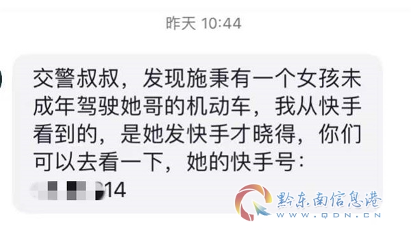 2021年12月29日,貴州省施秉縣公安局交警大隊接到網友舉報:一女子無證駕駛在“快手”上發布視頻,并與網友互動稱我才17歲沒有駕駛證。收到舉報后,公安交警與網安大隊聯合立即展開調查,并迅速鎖定違法嫌疑人張某某。