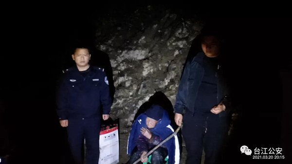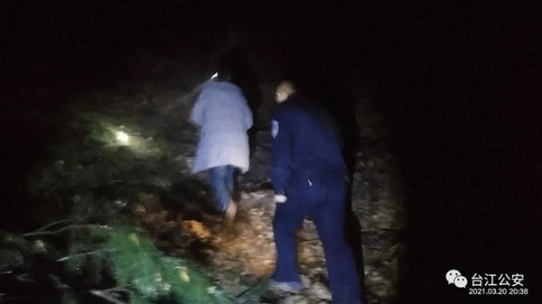 接到指令后,老屯派出所值班民警及時聯系報警人,因報警人所說的地方不是很明確,只能大概描述是老屯鄉與革一鄉一處地界油茶基地。民警經多方聯系和溝通,最終確定是在報效行政大村新寨村四組坡上一處茶油基地(新開的項目),地名叫“展扎”。民警在報效村支書帶領下,冒著毛毛細雨從新寨村四組山路往坡上前行,經過近兩個小時的山路跋涉,于晚上20時10分趕到現場。在趕往現場的途中,民警告知報警人趙某方要盡力保證老人的安全。報警人在老人休息的地方升起火堆和加蓋衣物確保老人不被凍壞。