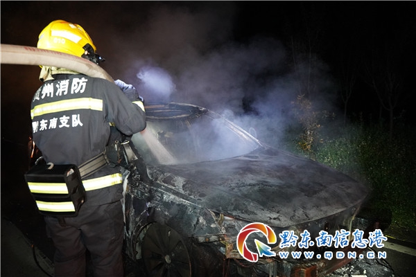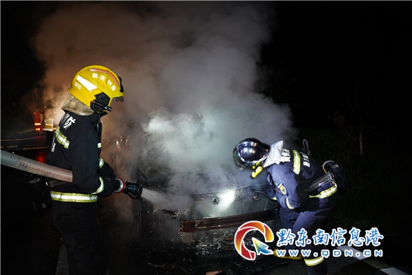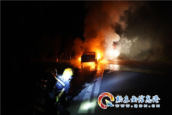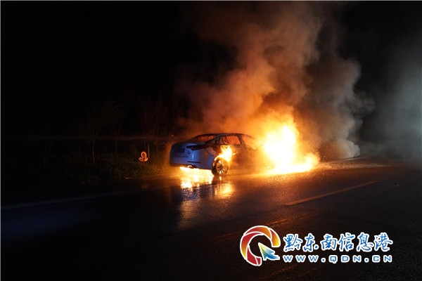 本網訊 5月11日20時37分,在臺江G320國道打革壩路段,一輛行駛中的小汽車突發自燃,駕駛員發現發動機蓋冒煙后,緊急停靠路邊,下車后立刻報警求助。隨后駕駛室和發動機蓋燃起熊熊大火。臺江縣消防救援大隊接到報警后,立即出動趕往現場救援。