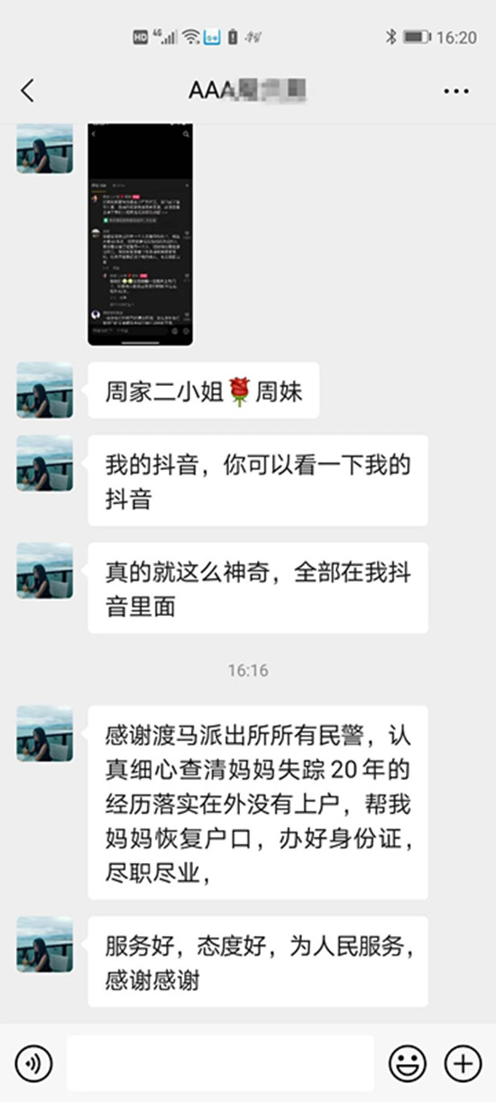 原來,蔣某慧是貴州省天柱縣鳳城鎮(zhèn)人,1984年與天柱縣渡馬鄉(xiāng)龍盤村周某錫自由戀愛,與周某錫生活了18年,育有三個女兒。由于家庭貧困,于1997年獨自外出廣東省東莞市打工,后杳無音信。周某錫因妻子蔣某慧外出務(wù)工后多次尋找未果,便到派出所申報了失蹤。2021年3月4日周某錫的二女兒周某芝在抖音大熱門上發(fā)布了題為《希望媽媽能刷到我的抖音、媽媽2000年出去打工就再也沒有回來》的尋母視頻后,在湖南的朋友告知她,她母親現(xiàn)在到湖南省衡陽市常寧市西嶺鎮(zhèn)生活,獲此情況后隨即前往湖南尋找確認其母。后周某芝了解到蔣某慧因當年外出務(wù)工時沒有辦理居民身份證,在湖南生活期間也未解決其戶口問題,給她的生活和出行帶來了極大不便。周某芝隨即將此情況向天柱縣公安局渡馬派出所民警反映,民警耐心告知了周某芝該怎么為其母親解決戶口問題。2021年3月26日,周某芝帶著蔣某慧到天柱縣公安局渡馬派出所,見到蔣某慧本人后,派出所戶籍民警立即向所領(lǐng)導(dǎo)及上級戶政部門匯報,并迅速走訪知情人,制作詢問筆錄,在最短的時間內(nèi)收集了相關(guān)證明材料上報,最后成功為蔣某慧補辦了戶口,并免費為其辦理了第二代居民身份證。