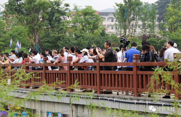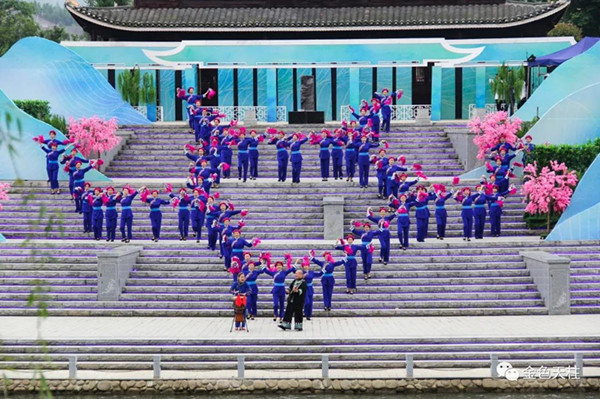 表演中,一條由20余只木排連接而成的金色“長龍”緩緩駛過舞臺前方。鼓點聲、吶喊聲與舞臺上的開場節目《山歌水舞》遙相呼應,共同“點燃”現場。全體演員以飽滿的精神狀態,認真細致的動作表情,將富有北侗民族特色的《略板略》《鮮花滿坡歌滿河》《對歌對到日落坡》《北部侗族民歌》和極具震撼的《唱支山歌給黨聽》等精彩歌舞表演,逐一呈現給現場觀眾。觀眾們也紛紛拿出拍攝設備記錄下這美好、精彩時刻。