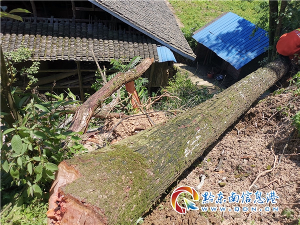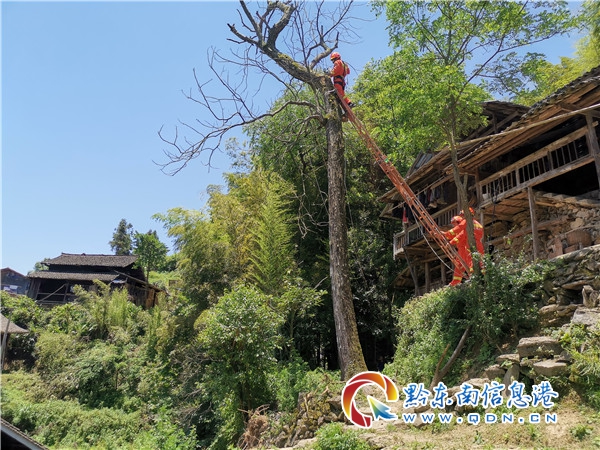 本網訊 6月6日8時30分,天柱縣消防救援大隊接到群眾求助電話稱:天柱縣坪地鎮法溪村八二組居民房屋路邊一顆大樹近日受大風影響嚴重傾斜,危及樹下房屋安全,請求消防幫忙排憂解難。