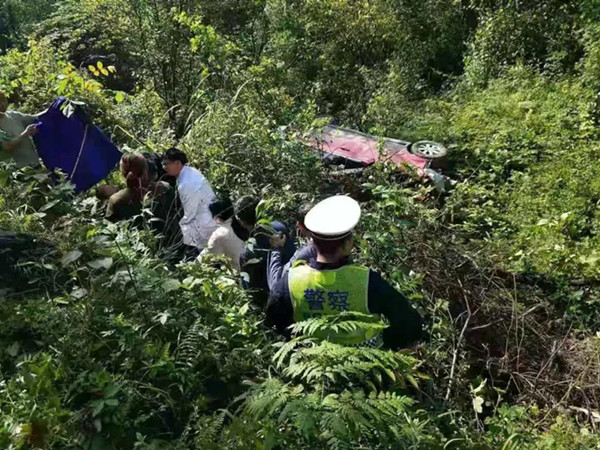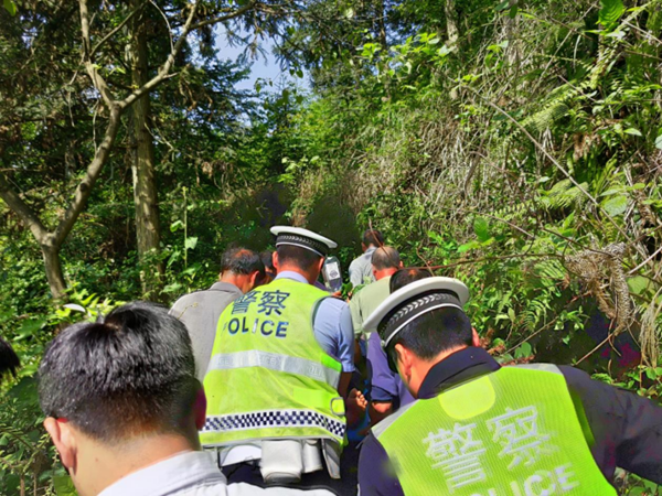警情就是命令,接警后,交警四中隊立即組織警力趕赴現場,車輛在山中泥濘道路下坡轉彎處沖下山腳側翻在地,發現一男子(駕駛員)正在嘗試將被困在副駕駛的妻子背離事故車,轉移傷者到平緩地帶,該男子看見前來救援的警察,如同看到救命稻草一般,不停拼命呼喊。當眾人合力把該副駕駛女子轉移到安全平緩地帶才是稍微松了口氣。