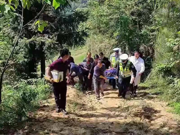 交警四中隊、醫務人員、竹林鎮政府、竹林派出所、栗木村委人員相繼趕到現場后,經現場溝通,該男子(駕駛員)并無大礙,副駕駛女子頭昏胸悶,口干舌燥,情緒不穩定。于是,民警一邊組織周邊村社群眾準備擔架床對該女子進行施救,一邊不停和該女子進行溝通,緩解其壓力、平復其心情,同時組織村民帶路將受傷人員抬上救護車,進行第一時間檢查救治。